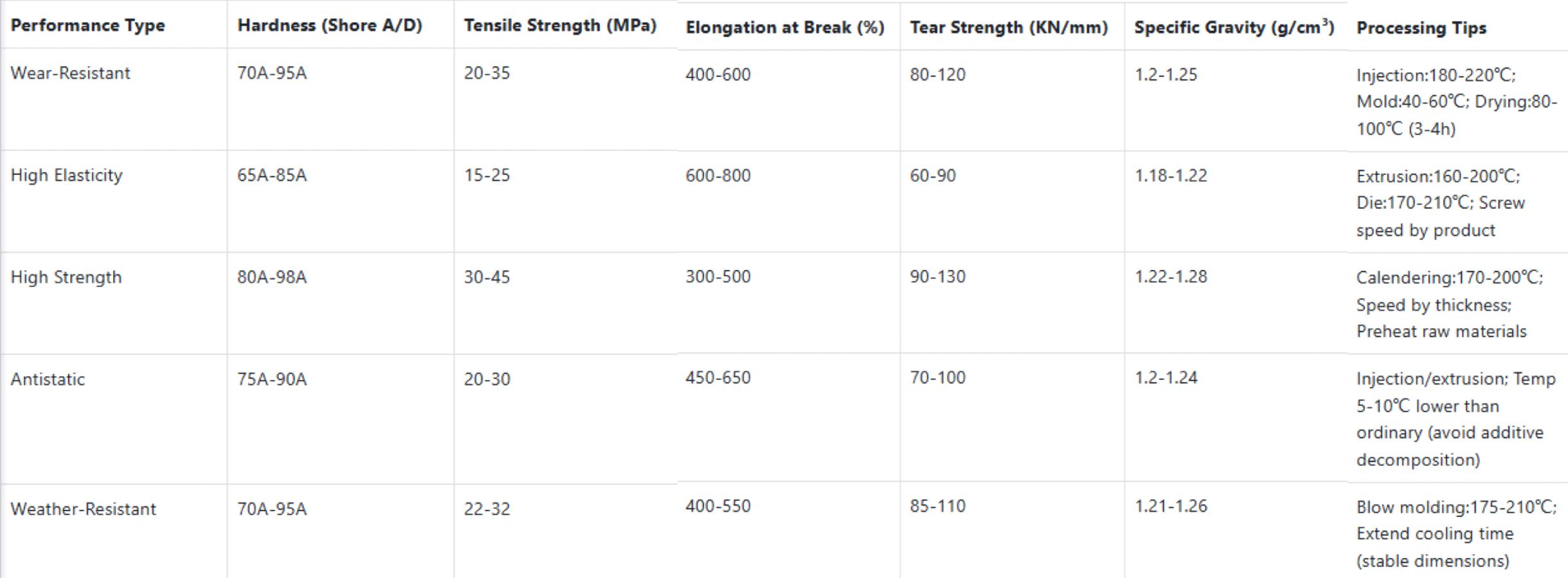 Zmodyfikowane związki TPUsą wytwarzane poprzez zaawansowane procesy modyfikacji, zawierające określone dodatki funkcjonalne podczas produkcji. Oferują doskonałą regulację wydajności, umożliwiając właściwości, takie jak odporność na ścieranie i odporność na pogodę do dostosowania do wymagań przy jednoczesnym utrzymaniu podstawowych właściwości mechanicznych. Co najważniejsze, ich nieodłączna elastyczność i elastyczność są zachowane, ułatwiając późniejsze przetwarzanie i formowanie. W porównaniu ze standardowymi materiałami TPU związki te zapewniają bardziej ukierunkowaną wydajność.